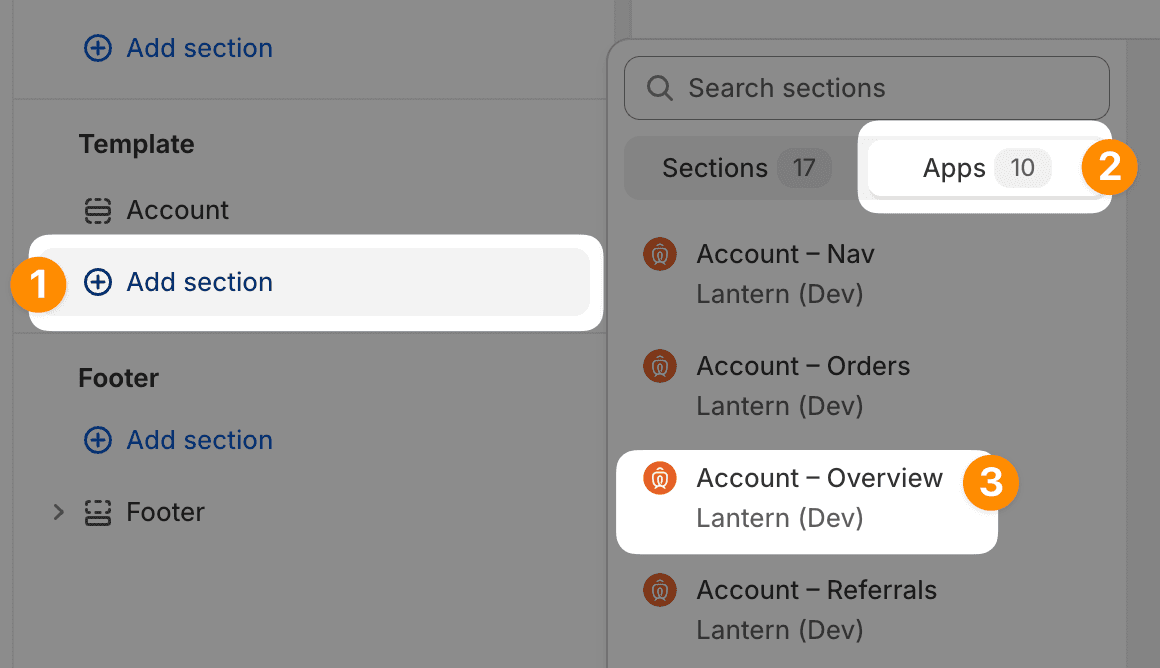 Now that your Lantern app embed is enabled, you can start adding extensions to your theme. In this example, we'll add some new features to the logged in Customer Account page. These steps will work for any template.
