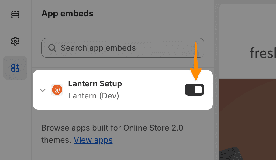 - Toggle the Lantern Setup app embed on as shown in the screenshot below. If you don't see it in the list, try searching for Lantern in the Search app embeds search box.